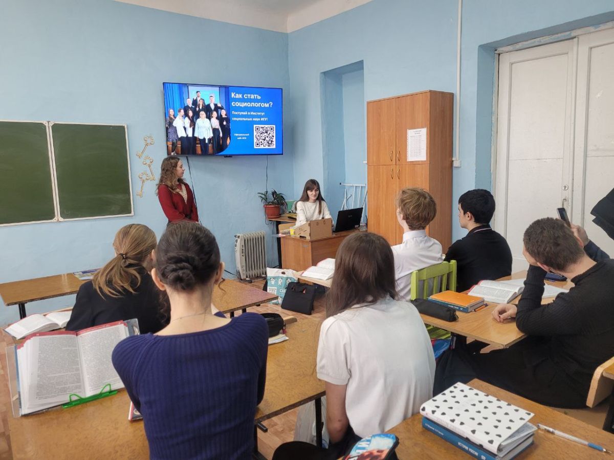 4 и 5 марта 2026 года студентки третьего курса направления подготовки «Социология» Юлия Габдулхакова и Елизавета Шевцова провели в своих родных школах – МОУ Школа №5 и МОУ Лицей города Черемхово – три профориентационных «урока» с презентациями и видеороликами для учащихся 10-х и 11-х классов, на которых присутствовали более 60 человек.