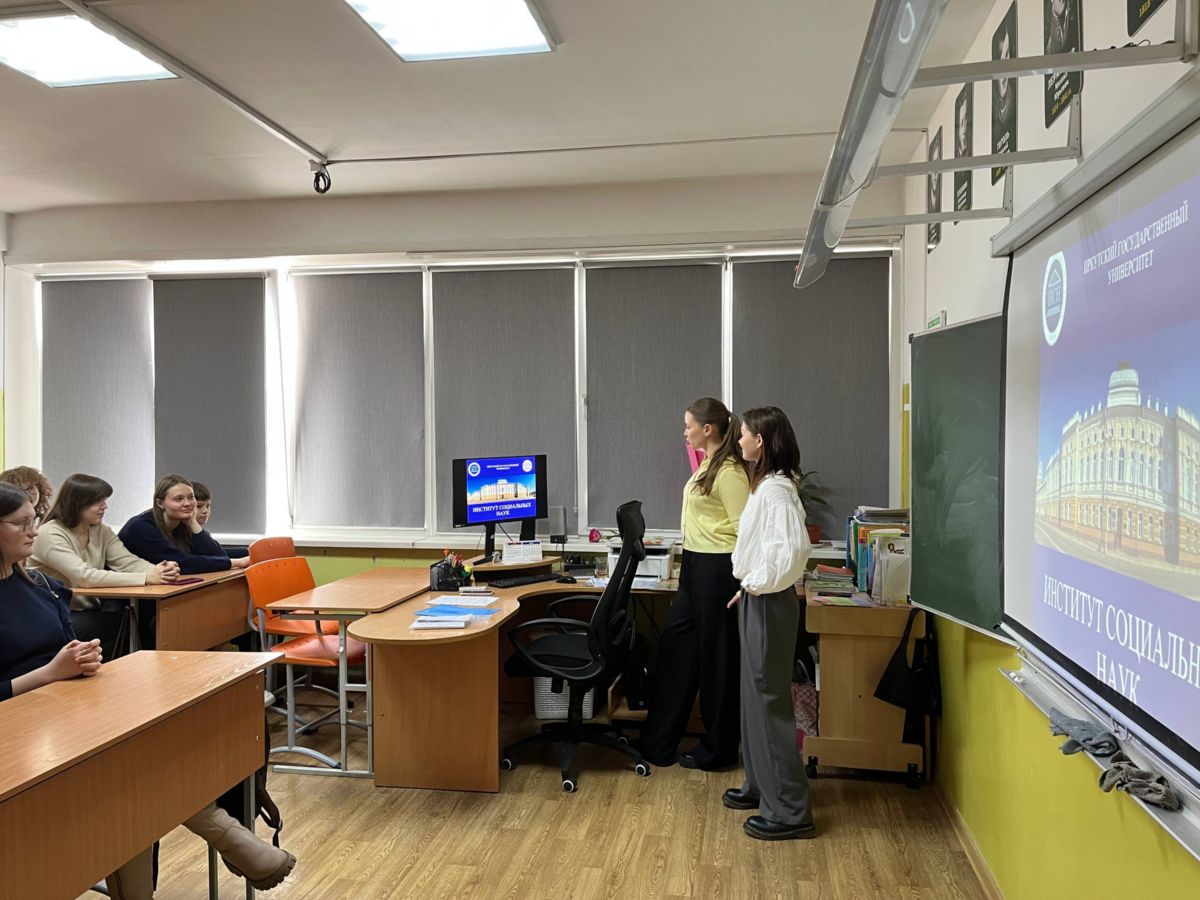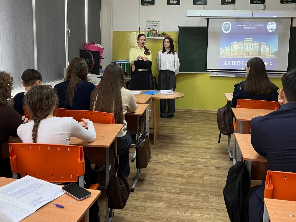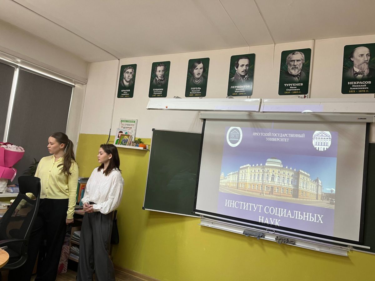 16 марта 2026 г. студенты 2 курса направления подготовки «Государственное и муниципальное управление» Зайцева Екатерина Александровна и Кулакова Полина Александровна под руководством к.ф.н., доцента кафедры государственного и муниципального управления Хохловой Ольги Михайловны провели профориентационную встречу «ИСН – это твой путь к успеху!» в гимназии № 2 г. Иркутска.